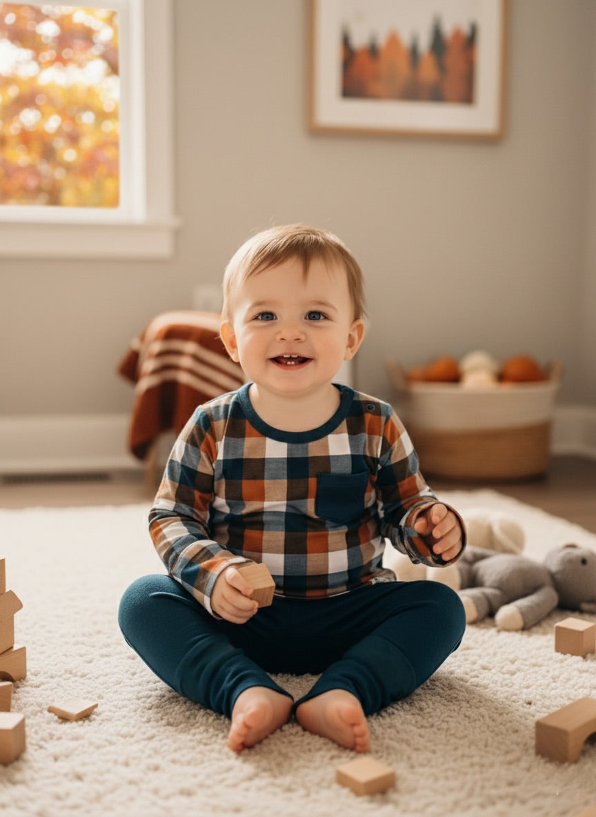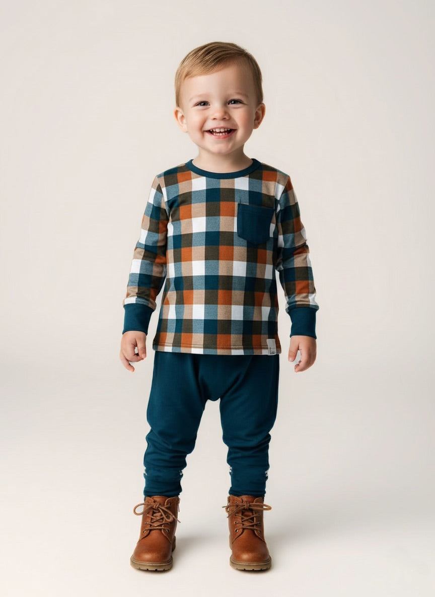 Cozy up in style with our Aspen RompSet™ perfect for both boys and girls! Featuring a rich, seasonal checkered top and deep teal bottoms, this one-piece romper gives the look of a full outfit with the ease of a single piece. Made from our signature ultra-soft bamboo and designed with a unique middle opening for quick changes, it’s perfect for crisp days, pumpkin patches, and everything in between. Pair with the Aspen Headband to complete the outfit for a little girl!