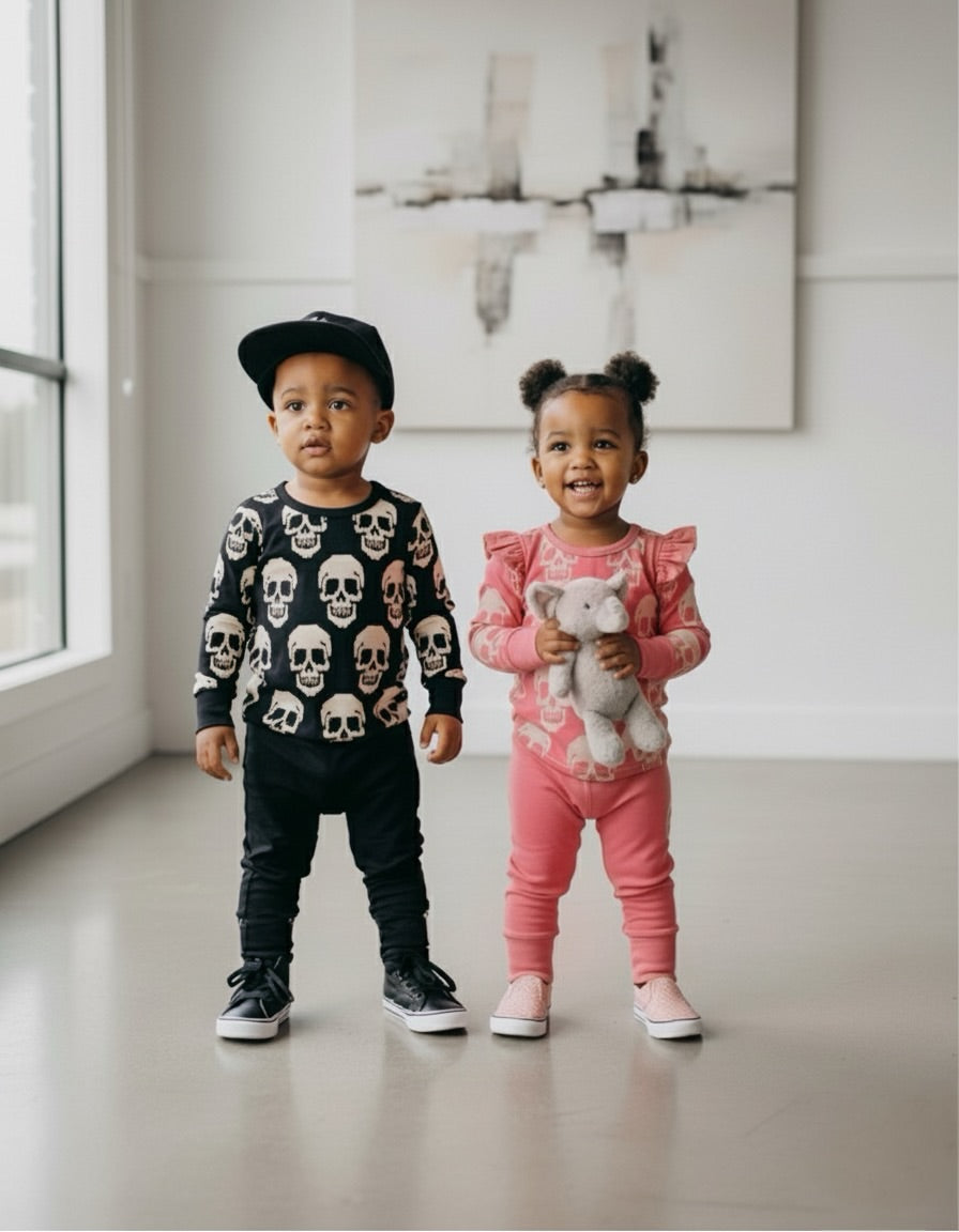Meet the Jack RompSet™ — spooky, stylish, and made for little ones who love to stand out. This Halloween-ready romper features bold skulls on top, jet-black bottoms, and our signature one-piece design with a unique middle opening. This RompSet™ features a faux sweater type print making this cool, comfy, and creepily cute for the season!
