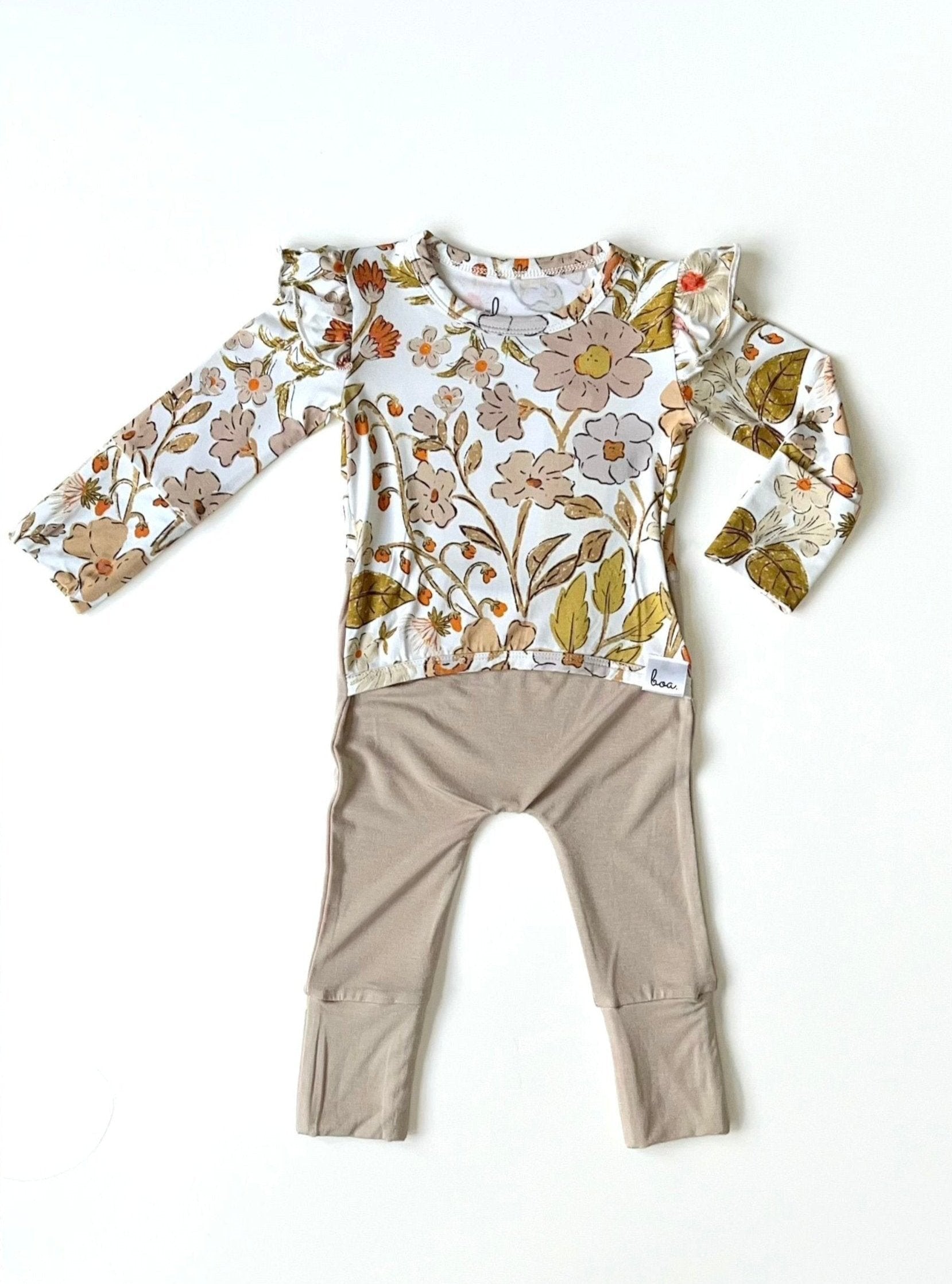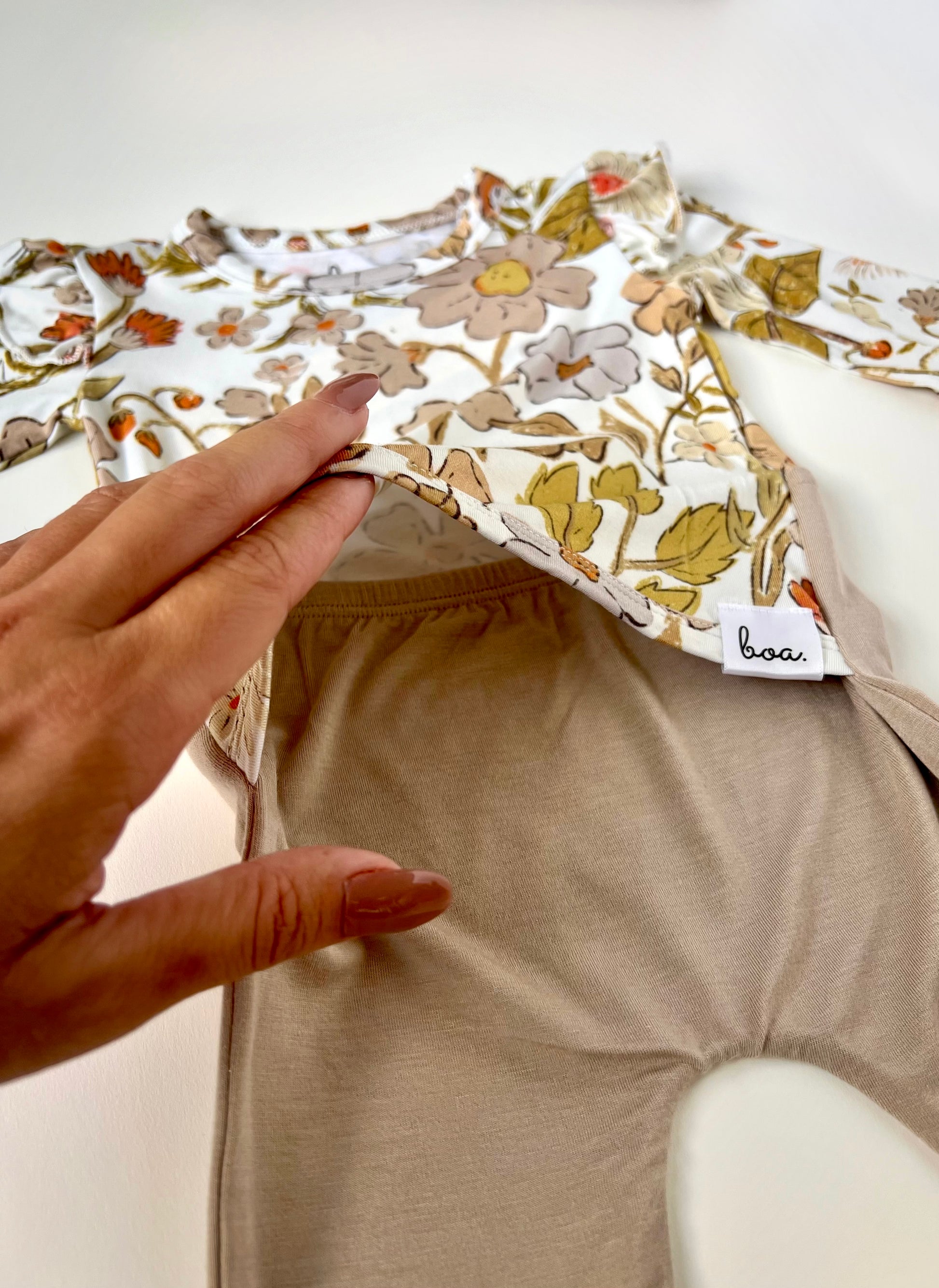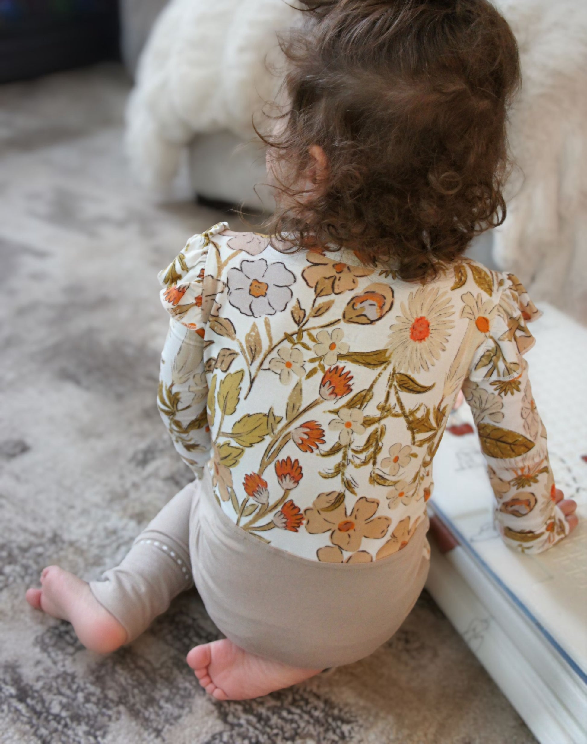 Featuring beautiful hand-drawn, fall florals with chic flutter sleeves, the Lola bamboo RompSet™ keeps your baby stylish and cozy all season long.