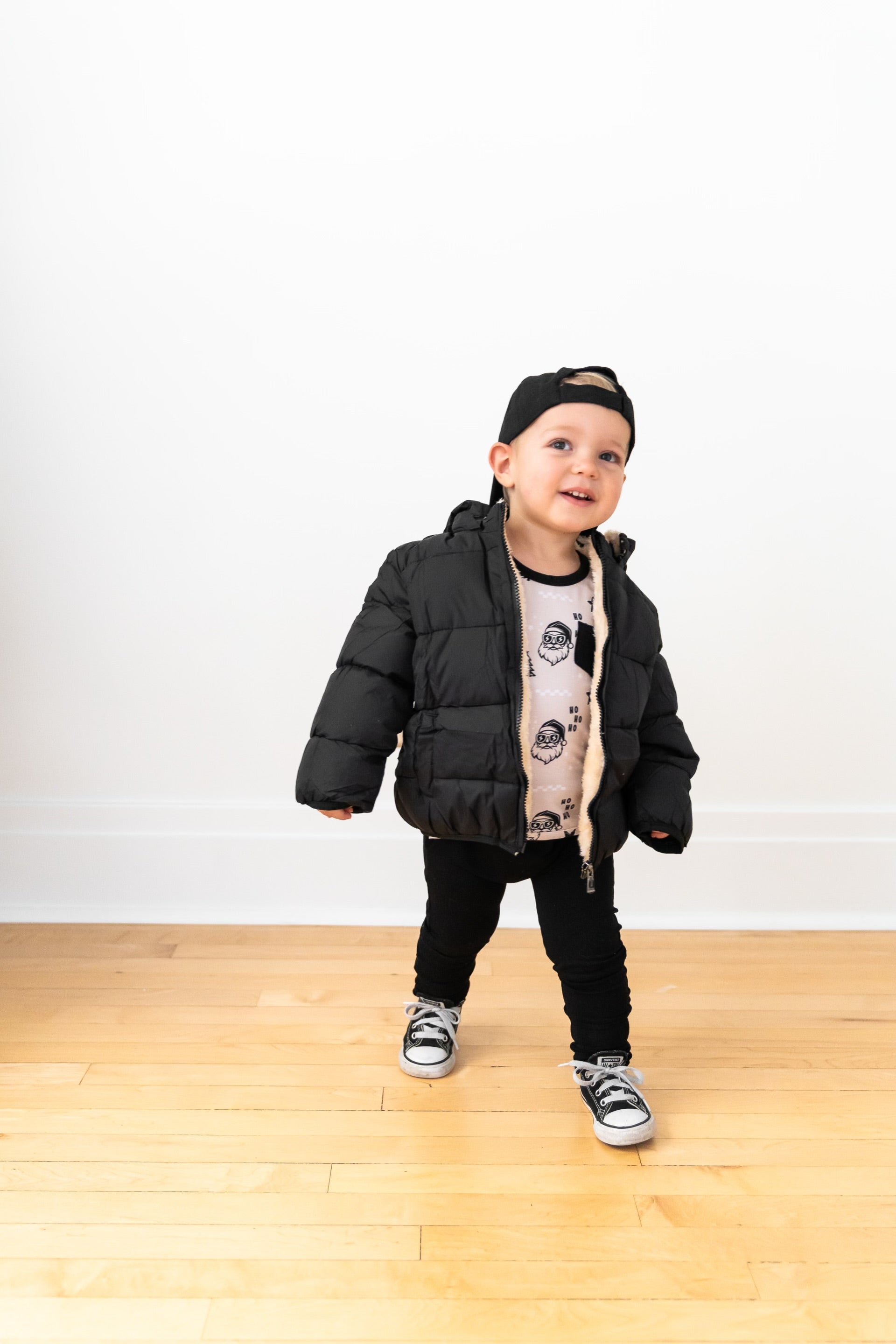 The Nico RompSet™ is bringing the cool to holiday style! With an edgy Santa print, fresh front pocket, and slick black pant, your little one will be “sleighing” the season in style! Pair this outfit with the matching Nico headband or bib to have a very hip ensemble through and through.