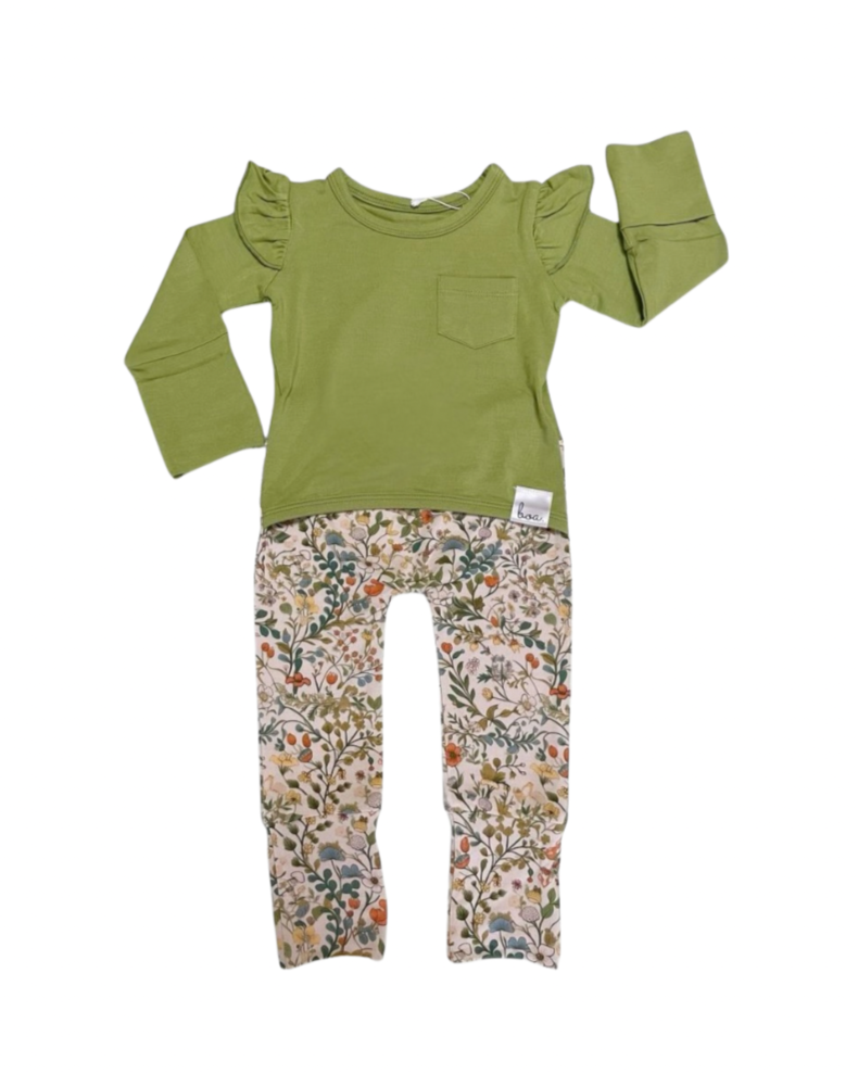Soft, elegant, and effortlessly charming, the Eden RompSet™ features a rich green top paired with delicate floral pants. Designed for comfort and style, with no snaps or zippers—just an easy, whimsical look for your little one!