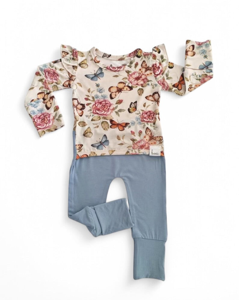 Embrace spring with the Fiona RompSet™ – featuring a vibrant butterfly pattern and soft blue pants for a fresh, chic look!